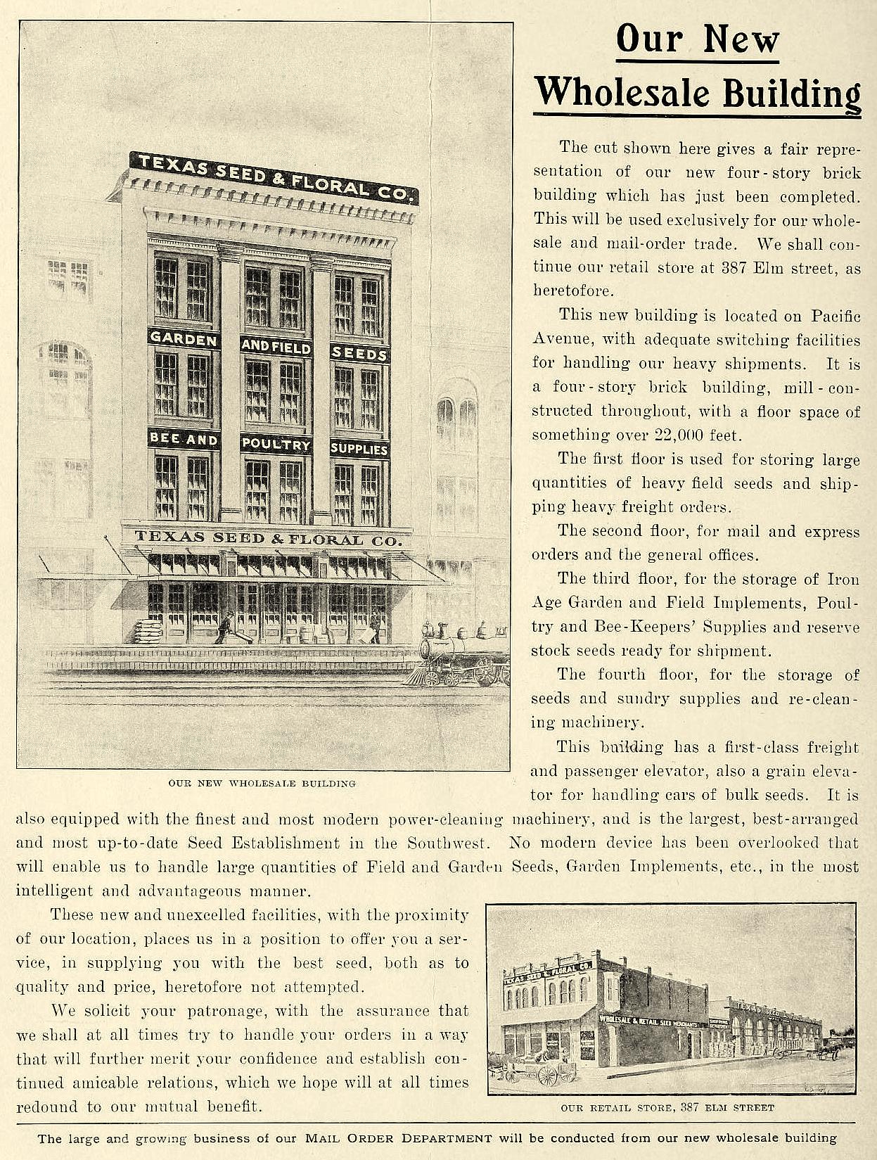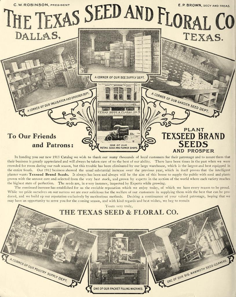 The great progress which has been made in agricultural and horticultural lines in the southwest has resulted in an ever increasing demand for a high quality of seeds, and to meet this demand many reliable seed houses have been established, among which is the Texas Seed & Floral Co., whose retail store is at 387 Elm street, and whose office and warehouse department is at 311-313 Pacific avenue. The line of seeds carried in stock includes all kinds of garden and flower seeds as well as field seeds, their leading brand being known under the name of “Texseed,” and they have the exclusive right to sell this brand in the southwest.