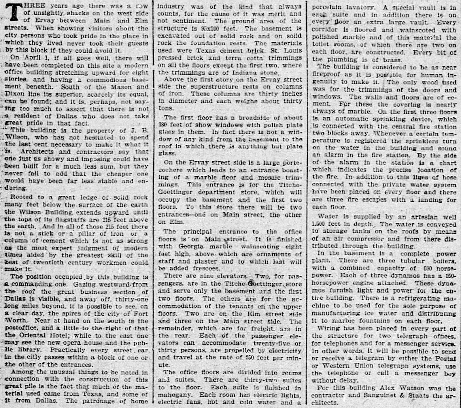 The two photos and article below ran in The Dallas Morning News on March 13, 1904 under the headline “Completion of the Great Eight-Story Wilson Building in Dallas.” The caption of the photo immediately below read “This view was taken from the postoffice, and is the first to show the entire Ervay street front.”