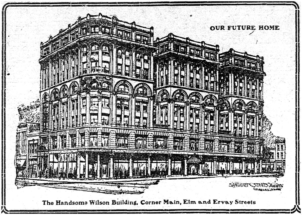 See photos of the original building under construction in the Flashback Dallas post “The Wilson Building Under Construction — 1902.”