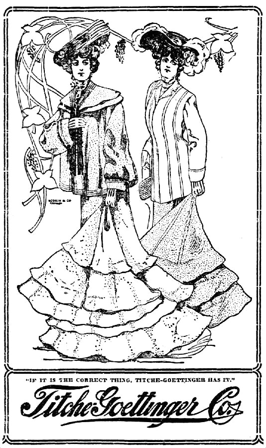 Below are a couple of details from a “coming soon” ad from Titche-Goettinger in September, 1903, showing a drawing of the building (still under construction) from the Fort Worth architectural firm Sanguinet & Staats. (All images are larger when clicked.)