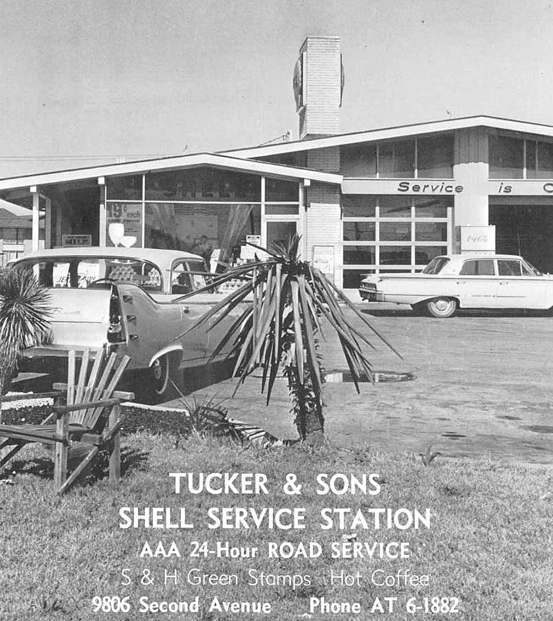 Apache Drive-In, 316 South St. Augustine. “Around the Bend to the Apache Den.” (The Spruce High School mascot was the Apache.)