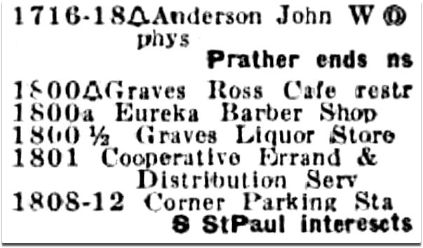 The photo immediately above shows the Roosevelt Cafe, which was at 201 N. Central, and the North Pole Domino Parlor (a partial window sign is seen at the right), at 207 Central. A train is passing. This photo and the photo at the very top both show partial signs for Black Dallas beer. (All images are larger when clicked.)
