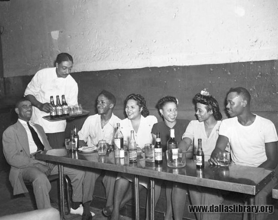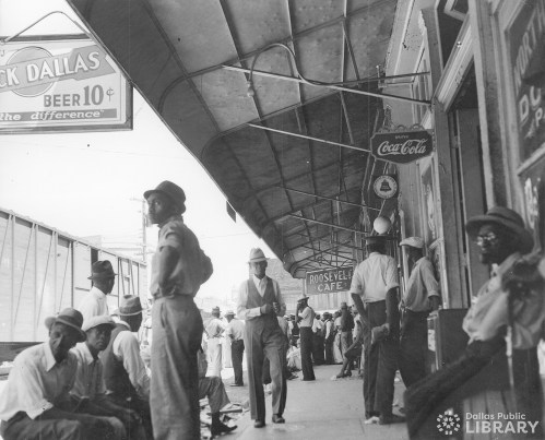The third photo — “[African American men seated on benches and standing outside of the Roosevelt Cafe in downtown Dallas in the 1930’s]” — is from the Saxon Collection, Texas/Dallas History & Archives Division of the Dallas Public Library; its call number is PA85-16/5.