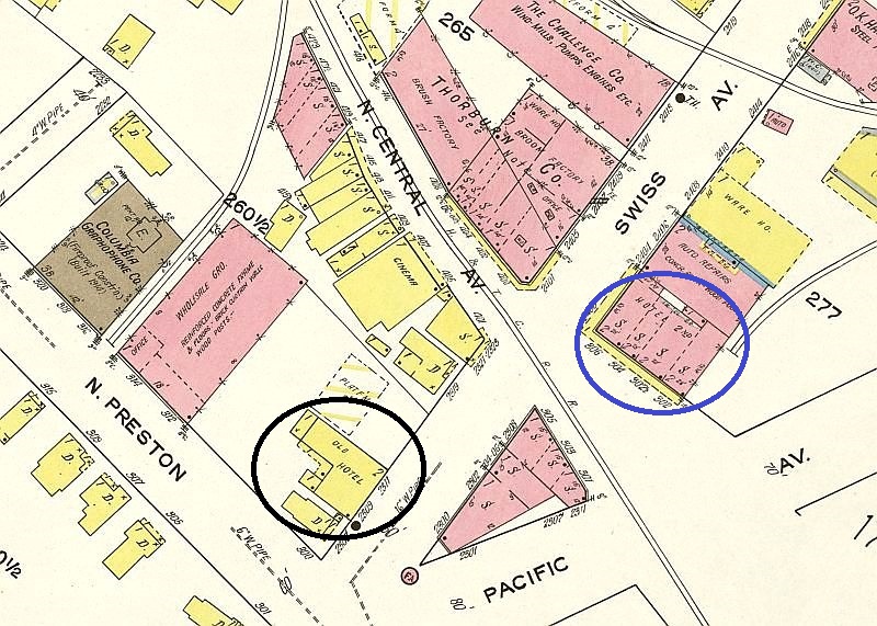 In the undated photo above, businesses in the retail strip are the Top-O-Hill Food Mart, the Ebony Cafe (Pit Bar-B-Q), the Easy-Wash laundromat, the second location of the Cochran Street Record Shop, the Star Theatre, and hotel apartments.