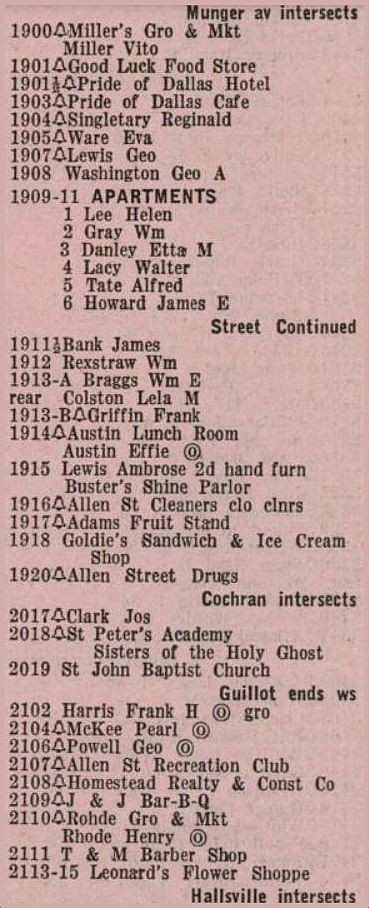 This hub of businesses was popular with neighborhood residents, who referred to this area as “Show Hill” (for the picture show). I stumbled across a really wonderful 2018 oral history of Margaret Benson, who, in 1944, moved with her family to Dallas and attended N. W. Harllee Elementary School and both Lincoln High School and Madison High School. She describes these shops and says that whenever black entertainers such as Dinah Washington or Sister Rosetta Tharpe came to town, they frequently stayed in the apartments above these businesses, as hotel accommodations for African Americans were few and far between. (I loved the entire recording of Mrs. Benson reminiscing about living for most of her life in this area of Oak Cliff — the part where she specifically talks about “Show Hill” is at the 8:25 mark in the recording at the link above.)