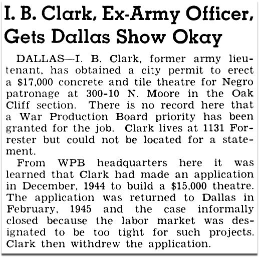 The ad for the Star Theatre appeared in the Dallas, Texas Negro City Directory, 1947-1948 (many thanks to Pat Lawrence). The address for the theater was listed in various places as both 300 N. Moore and as 1401 E. Eighth.