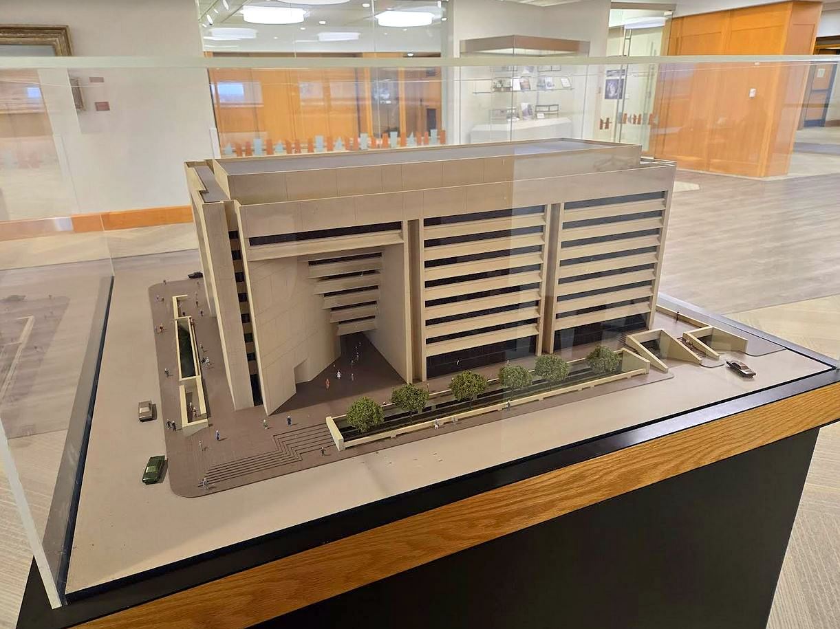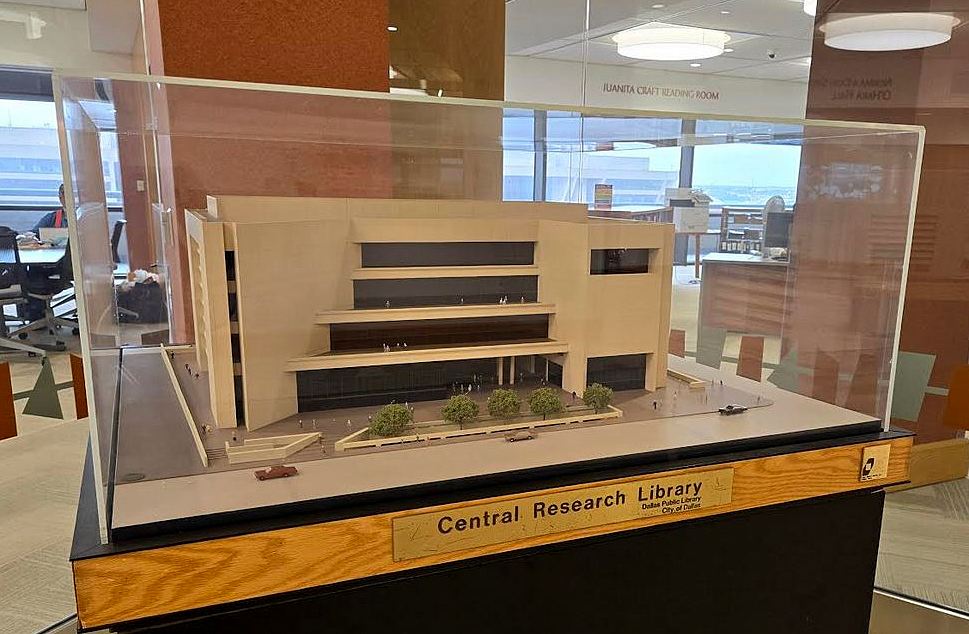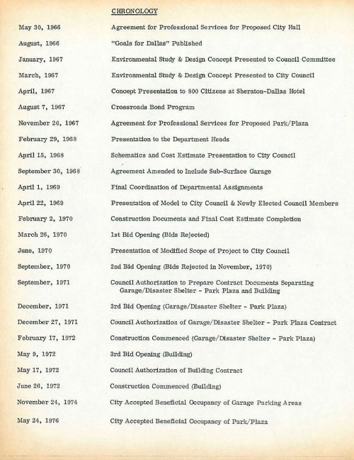 Construction photos, “Goals for Dallas” quote, color model photo, and chronology are all from the presentation binder Dallas Municipal Center by associated architects I. M. Pei & Partners and Harper & Kemp (July 5, 1976) (Dallas History & Archives/Dallas Public Library call number R690.513 D145).