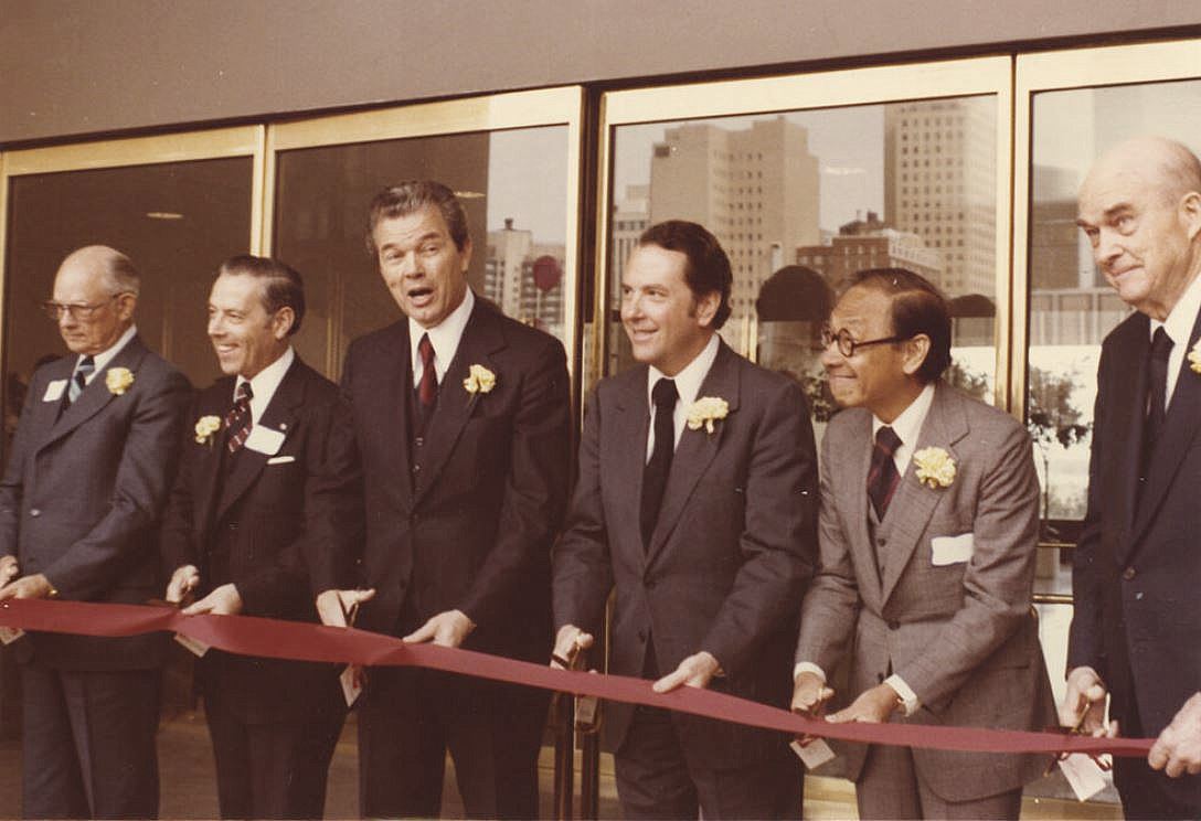 Finally, Dedication Day, March 12, 1978 — Pei is seen cutting the ribbon with (left to right) former City Manager Scott McDonald, current City Manager George Schrader, Mayor Robert Folsom, former mayor Wes Wise, and the man who started the whole thing rolling, former mayor J. Erik Jonsson (Pei said that his two greatest allies in the long slog to get the City Hall finished — and to continue with other projects in Dallas — were Schrader and Jonsson, both of whom he was quite fond of and considered friends):