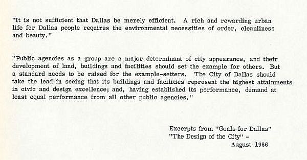 In the project plans presented to the City, I. M. Pei & Partners included these quotes from “Goals for Dallas,” the blueprint that Dallas leaders created for the city’s future: