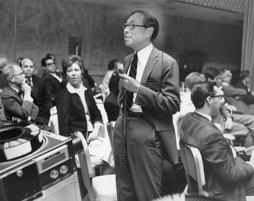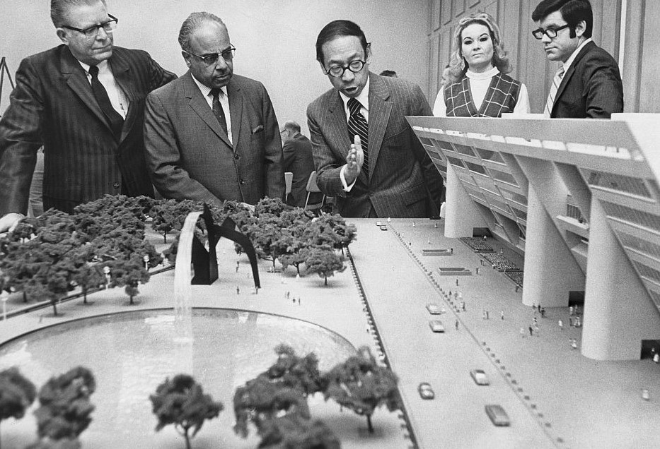 I. M. Pei giving a presentation in Dallas, in which he unveiled his vision for the new city hall (April 28, 1967, Dallas Times Herald photo by Ken Hardin):