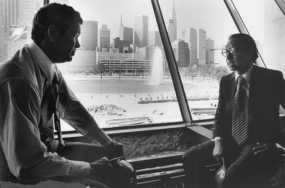 Pei with new mayor Robert Folsom, with a killer view of the Dallas skyline behind them (July 7, 1976, DTH photo by Jay Dickman):