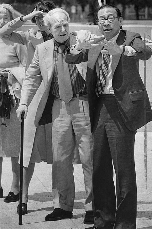 Pei shows British sculptor Henry Moore the site where his sculptural work The Dallas Piece will be placed on the City Hall plaza (April 14, 1976, DTH photo by Paul Iverson):