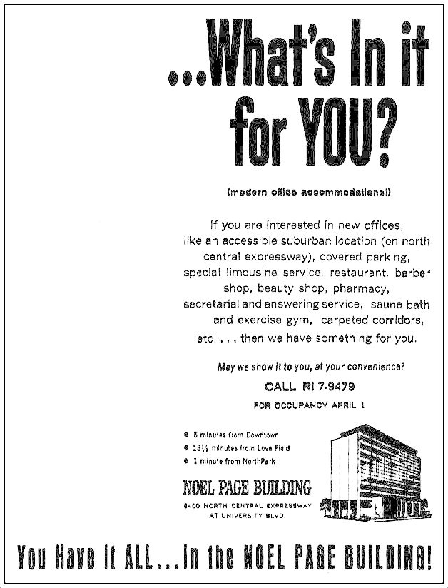 The developer/owner — a Dallas orthodontist named Noel J. Tomlin Jr. (1916-2003) — envisioned this office building as something of an answered prayer for businesspeople who didn’t enjoy the hassle of commuting to workplaces downtown (or, as he said in a 1965 Dallas Morning News interview, [a place] where parking is no problem and the business livin’ is easy”).