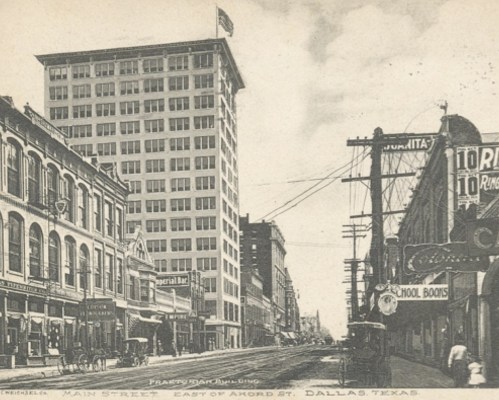 Its address was originally 350 Main — after the city-wide address change in 1911, it became 1518 Main. It appears to have opened in 1907 and was in business until at least 1918 (after Dallas voted to go “dry,” the former saloon became The Fountain Cafe). Here are a few early ads for the “High-Class Stags’ Cafe” in its early go-go “gentlemen’s resort” days: