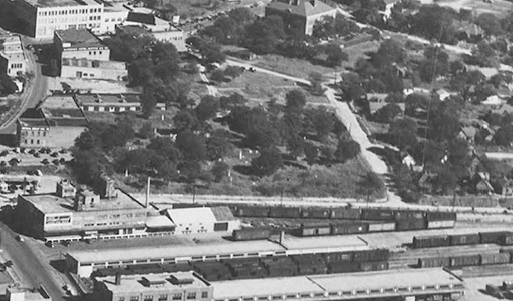 Another interesting image, looking to the northwest, with the Santa Fe freight depot (still standing on Young Street near Griffin) at the top right. (The cemetery land was apparently fifteen feet above the surrounding street level.)