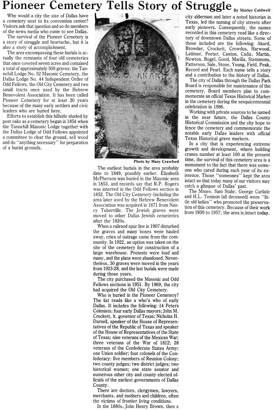 Below, a short history of the cemeteries, which appeared in the July, 1985 issue of Historic Dallas magazine: “Pioneer Cemetery Tells Story of Struggle” by Shirley Caldwell. (Click to read.)