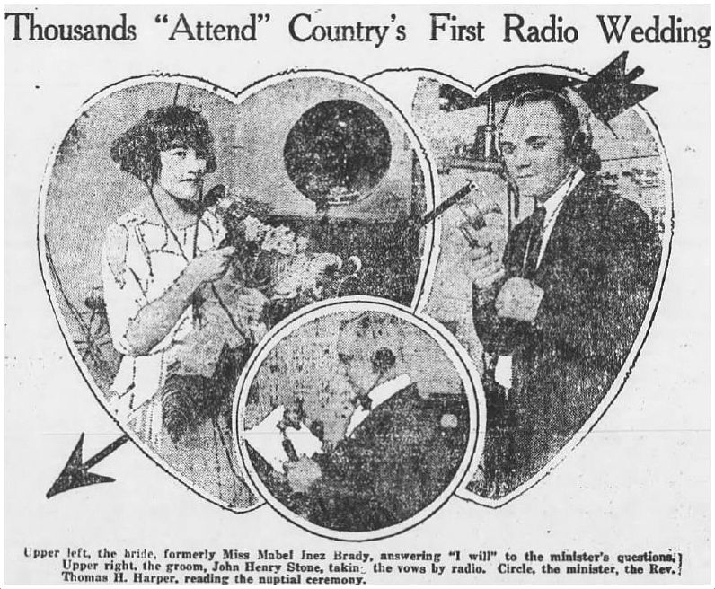DALLAS — The first wireless marriage ceremony ever performed in which neither the bride, the groom, nor the officiating minister will be at the same place is to be solemnized here Thursday night when Miss Inez Mabel Brady, Dallas society girl, becomes the bride of John H. Stone, operator at WRR, the municipal broadcasting station.