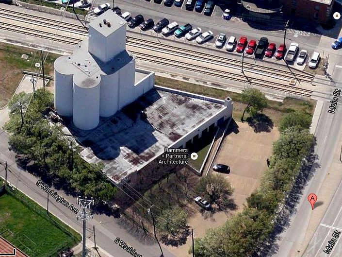 Last week I came across the above photo of old cars parked in front of a Fritos building of some sort, and I wondered where it had been. After a little bit of digging, I found out that it was near Fair Park — in the 3800 block of Main, between Washington and Exposition, on land right next to the railroad tracks. The building in the foreground appears to be gone now, but I recognized the white, rounded towers behind it — I never knew what that building was, but I now know that it is the Frito company’s former grain elevator. And it’s still standing. Which I’m thankful for (and a bit surprised by) since it’s always been one of my favorite buildings in the area.