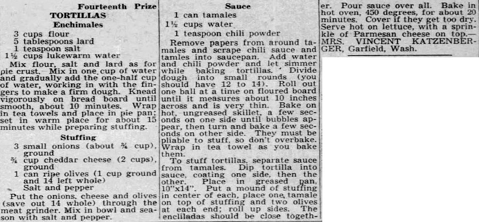 So. “enchimales.” I did a quick search on the word and found mentions back to 1934 for a cafe selling something with this name in Shreveport. For all I know, this is a traditional Mexican dish which I’ve just never heard of. BUT, I wonder whether any actual Mexican-related dish would bear any resemblance to the enchimales recipe devised by Mrs. Vincent Katzenberger of Garfield, Washington which appeared in Spokane’s Spokesman-Review newspaper? It was the 14th-place (!) winner in the “Meltin’ Pot” international cooking competition. Here’s a short synopsis of Mrs. Katzenberger’s dish, which is made like enchiladas: in a tortilla, place a filling of onions, cheddar cheese, and a can of olives (all of which has been passed through a meat grinder) — on top of that filling, plop one canned tamale; roll up this filled tortilla and place it in a baking dish; repeat a dozen or so times; cover everything with tamale sauce; bake; when done, serve on a lettuce leaf and top with sprinkles of Parmesan cheese. The recipe is here. If you make this, please let me know how it came out.