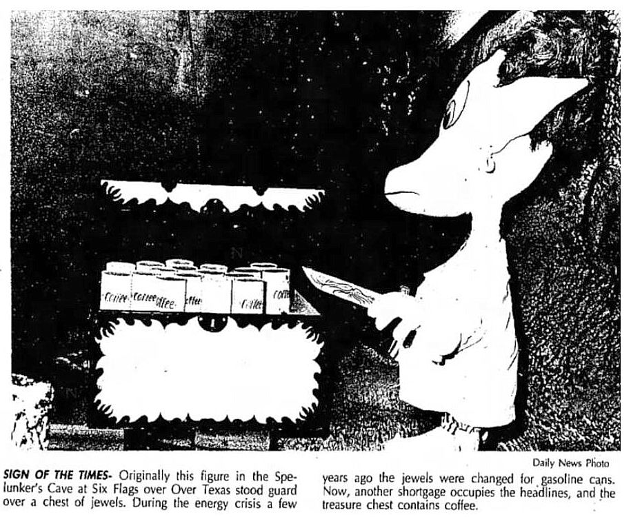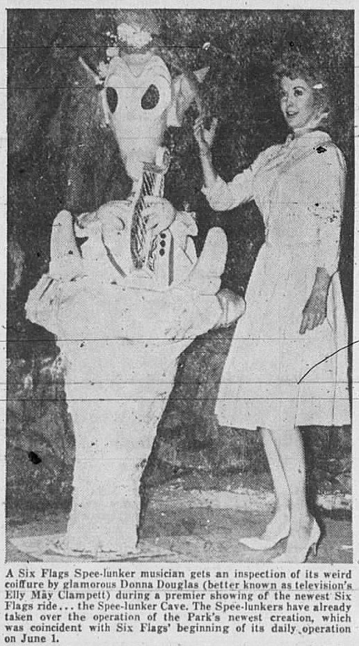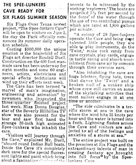 More on the new ride can be found in the Dallas Morning News archives in the article “$300,000 Hole: Six Flags To Open Cave Ride” (DMN, May 24, 1964) — accompanying the article is an amusing photo captioned “Gail Powers yelps in mock fear as lobster seizes her hand.”
