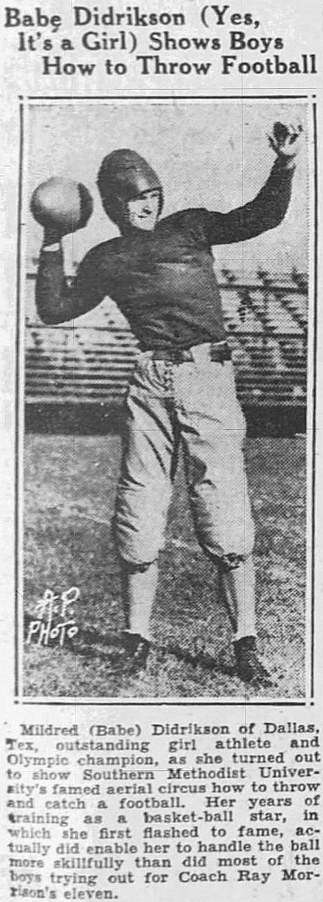 1932: Speaking of the SMU Mustangs, then-local sports superstar (and Olympics medalist) Babe Didrikson — who was proficient in every single sport she tried — was given the opportunity by SMU coach Ray Morrison to give football the old college try: he coached her in passing and receiving and even allowed her to suit up in an official uniform. She tried out her football moves for the public during a scrimmage in Ownby Stadium on September 18, 1932.