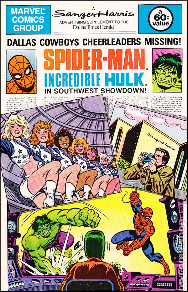 1981: In the tradition of other comic-book heroes appearing in Dallas to save whatever needed saving (here and here), Spider-Man and the Hulk stopped by to help with some football-related issue. The Dallas Cowboys Cheerleaders appear to have been involved.