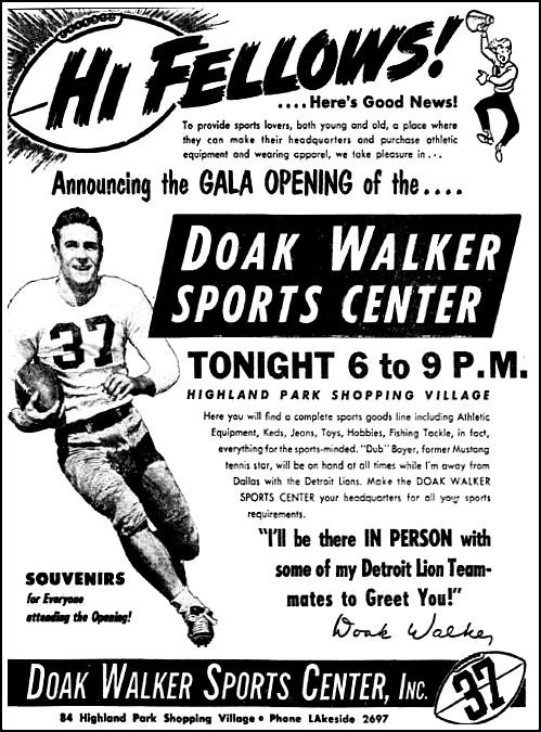 Doak Walker, the Heisman-winning superstar football player for SMU from 1945 to 1949, was, for a good forty-odd years, a partner in a successful sporting goods business that bore his name: the Doak Walker Sports Center. When it opened in Highland Park Village on August 23, 1951, the 24-year old — then playing pro ball with the Detroit Lions — was a bona fide celebrity, both locally and nationally. Predictably, the grand opening drew large crowds of sports fans eager to see their homegrown hero and check out the new place in town to get tennis balls and baseball bats (and, who knows, there might even have been some who showed up to see those unnamed Lions teammates the ads said he’d bring with him). The promise of “souvenirs for everyone!” was merely icing on the cake.