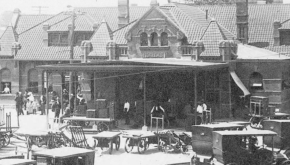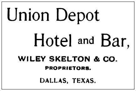 The large, two-story hotel (which also housed a popular cafe and bar) was built by William S. Skelton — more commonly known as Wiley Skelton — to cash in on the large number of travelers coming to Dallas via the bustling passenger depot right across the street. When it opened, it was charging a hefty two bucks a day (the equivalent of about $60.00 in today’s money) — a large-ish sum in 1899, but … location, location, location. This two-dollar-a-day rate to stay at Skelton’s hotel was the same as the base rate of Dallas’ ritziest, priciest hotels, The Windsor and The Oriental. How could Skelton’s “wrong side of the tracks” hotel charge similar rates as the city’s most elegant hotels? Convenience, convenience, convenience. The Union Depot Hotel could not have been more convenient to weary travelers unless it had been located inside the depot.
