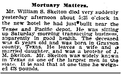 Skelton was a popular and successful businessman (and noted saloon pugilist) who was known far and wide for his substantial physical bulk. He was a founding member of the city’s “fat men’s club” and was reported to be the heaviest man in the city. When he died suddenly at the age of 45 (probably not a huge surprise, as his obituary mentioned that his weight had, at one time, reached 438 pounds), his new hotel had been open only weeks (perhaps only days).