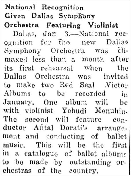 The first RCA Victor Red Seal recordings of Dorati’s Dallas Symphony Orchestra took place in January, 1946. One of the recordings featured Menuhin performing Bartok’s Concerto for Violin and Orchestra.