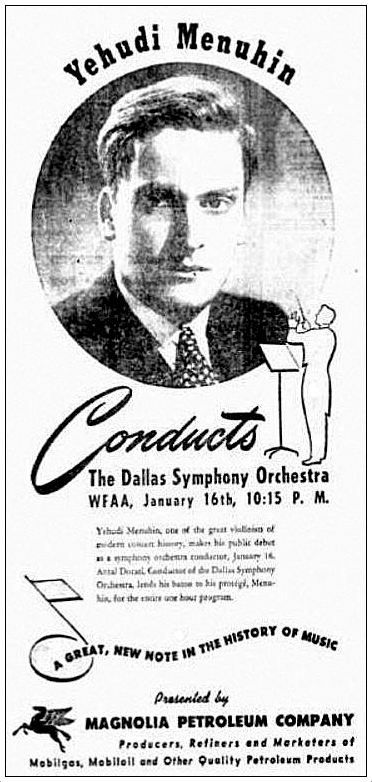 Yehudi Menuhin, one of the great violinists of modern concert history, makes his public debut as a symphony orchestra conductor, January 16. Antal Dorati, Conductor of the Dallas Symphony Orchestra, lends his baton to his protégé, Menuhin, for the entire one hour program.
