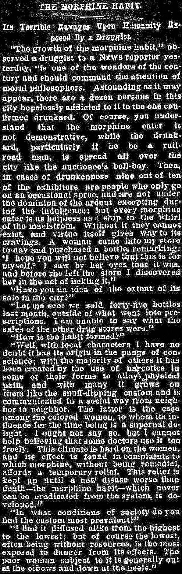 In the 1890s, Dallas had a big cocaine problem. And a big morphine problem. And a big opium problem. In fact, the whole country did. Before the over-the-counter dispensing of these drugs was made illegal, they were easily obtained in any drugstore. Cocaine was especially cheap: a nickel or a dime (the equivalent of about two bucks in today’s money) could get you plenty. Things seem to have hit the breaking point in Dallas in 1892, with scads of lurid cautionary tales about crazed and doomed hopheads filling the papers, but the problem had been building for a while.