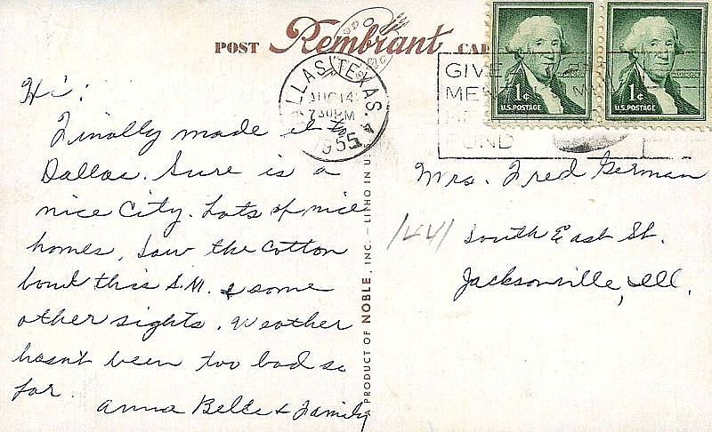 One of my favorite human-interest stories from the past year (meaning 1971!) was the profile of one of the few “lady mailmen” in Dallas at the time. She’s utterly, utterly charming, has a supportive and interesting husband and family, and loves her job. The Channel 8 cameraman shows her as she sorts her mail in the Beverly Hills Station post office in Oak Cliff and follows her as she walks along her route on West Davis. The only problem with this 7 minutes of interesting footage is that the woman is never identified. I dove in, really wanting to identify her. I thought I had cracked the mystery of her identity, only to find myself at a dead end again. If only her children could see this wonderful profile of their mother. If you know who this woman is, please let me know, and we’ll add her name to the YouTube description and try to track down any family members. I would LOVE her children to be able to see this.