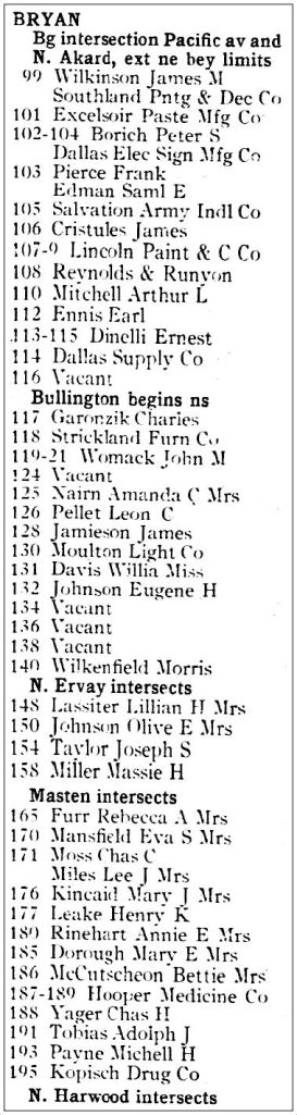 And across Bullington from Dinelli’s saloon was the Bryan St. Saloon owned by the Garonzik brothers, Will and Charles, at 117 Bryan (later 1601 Bryan). (That saloon had new owners practically every year.) Next door was the Hartman Construction Company at 119 Bryan (later 1603 Bryan). Next to Hartman were three large boarding houses.