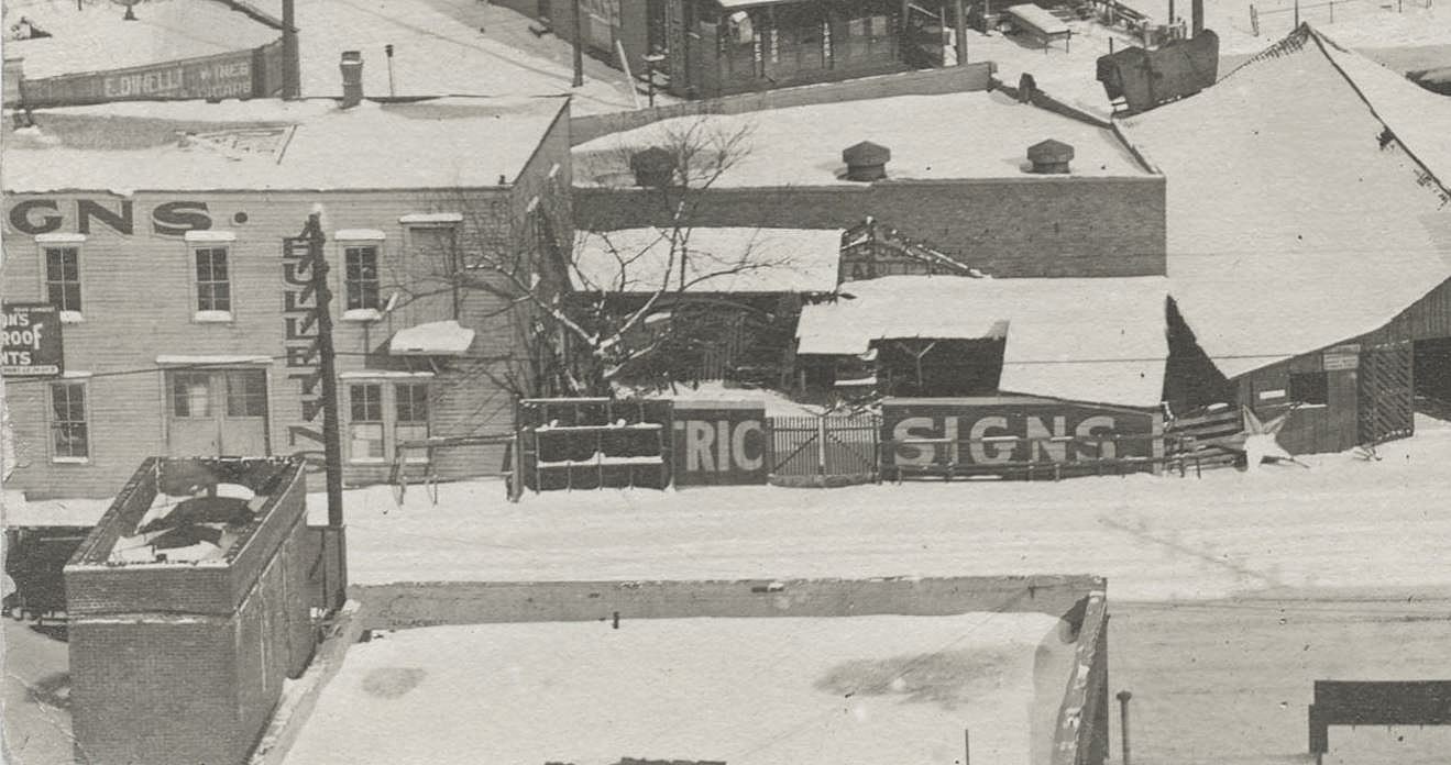 Because I’ve written about it a couple of times, I recognized the P. S. Borich electric sign company, seen at the bottom left of the original photo and in the detail below. It was located at 102-4 Bryan (later 1600 Bryan), where it meets Akard at a point. Borich also faced Pacific, and, in this photo, we are seeing Borich from the Pacific side. (For more about this important pioneer sign company — it later became Texlite — and to see a map of the area, I’ve written about the Borich company here and here.)