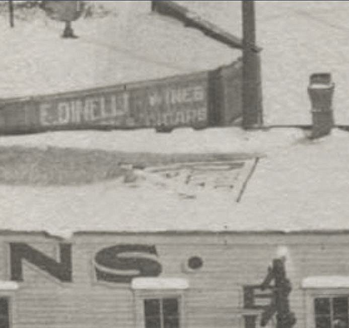 Across from the Borich company was a saloon (and “sleeping rooms”) run by Ernest Dinelli at 113-15 Bryan (later 1521-23 Bryan). A close-up of the top of his building is below. (Wine and cigars and… whatever else… all going on within strolling distance of First Baptist Church!)