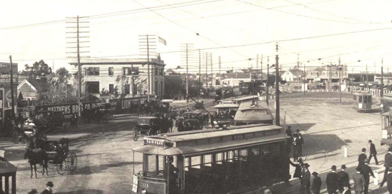 Below is the detail I’ve cropped from the larger photo, showing the Parry Avenue portion, with the still-standing firehouse at the top left.