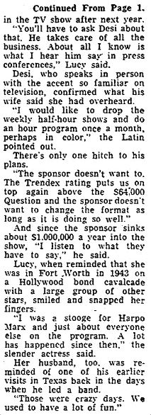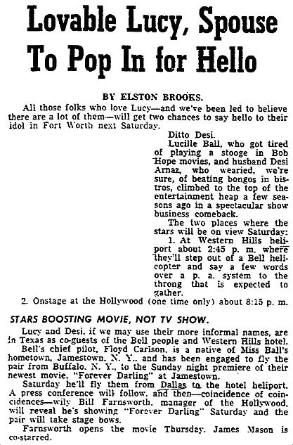 In Fort Worth, Elston Brooks (whose amusing articles I’ve really enjoyed discovering these past few months), seemed underwhelmed and a little annoyed at the prospect of “lovable Lucy and spouse” invading the city (click articles to see larger images):