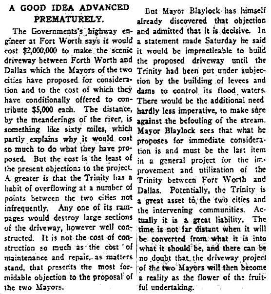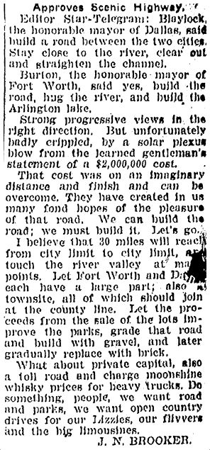 Last week the Dallas Mayor advanced the suggestion that the “necessary new road to Fort Worth” be planned along these lines. Both Mayor Blaylock and Mayor Willard Burton of Fort Worth have offered $5,000 each toward the new enterprise if nine other citizens in both places donate like sums.