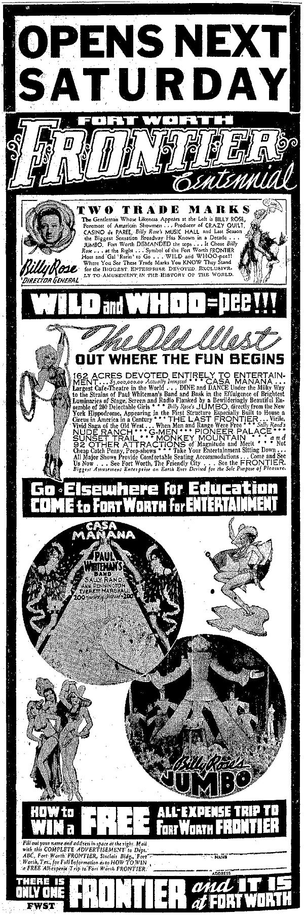 Broadway impresario Billy Rose was hired by Amon Carter to sex-up the Fort Worth expo and to do everything he could to draw more visitors to Fort Worth than to Dallas. Rose went so far as to have a HUGE electric sign (supposedly the second largest electric sign in the world) placed on top of a building on Parry directly opposite the entrance to Fair Park which read: