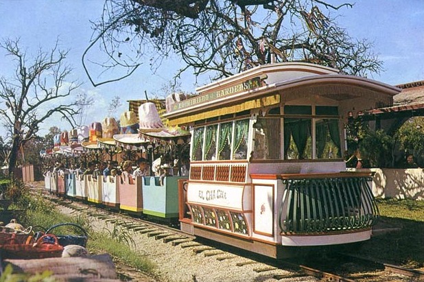 There was the Fiesta Train (which I was surprised to see was originally called Ferrocarril Fiesta), which was topped with colorful sombreros and chugged by all sorts of “festive” scenes which might seem a little culturally eyebrow-raising today.