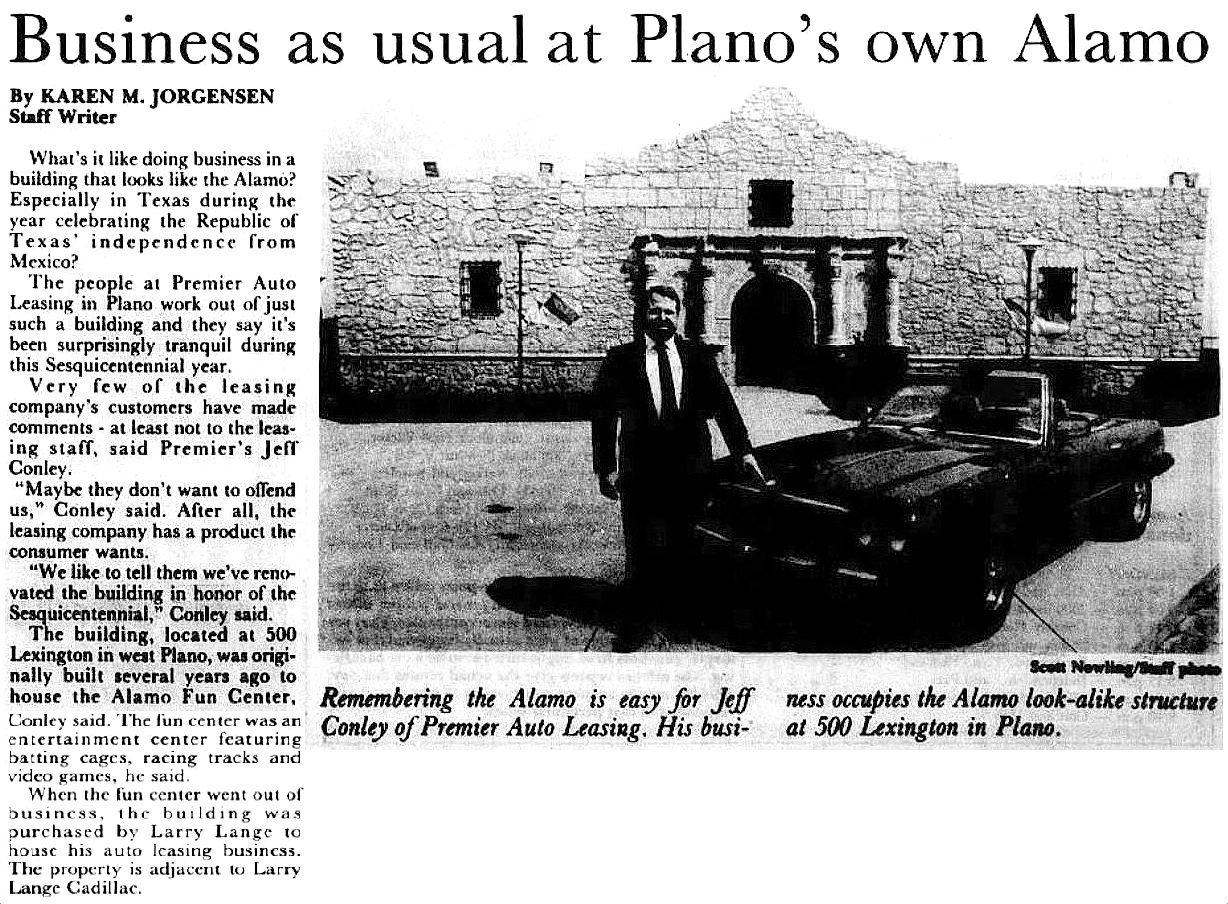 Two years later, in 1986 — the year of the Texas Sesquicentennial — The Plano Star Courier checked in with the then-current occupants of the hometown Alamo, Premier Auto Leasing, to see what it was like working in the Alamo. In Plano. An employee made the impossible-to-believe statement that very few people ever actually commented on the fact that they were leasing their vehicle from a company that occupied a building shaped like the Alamo.