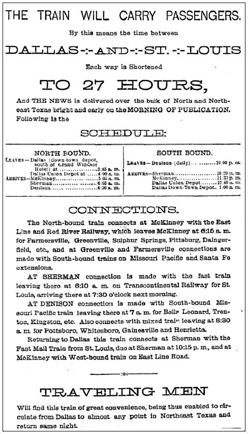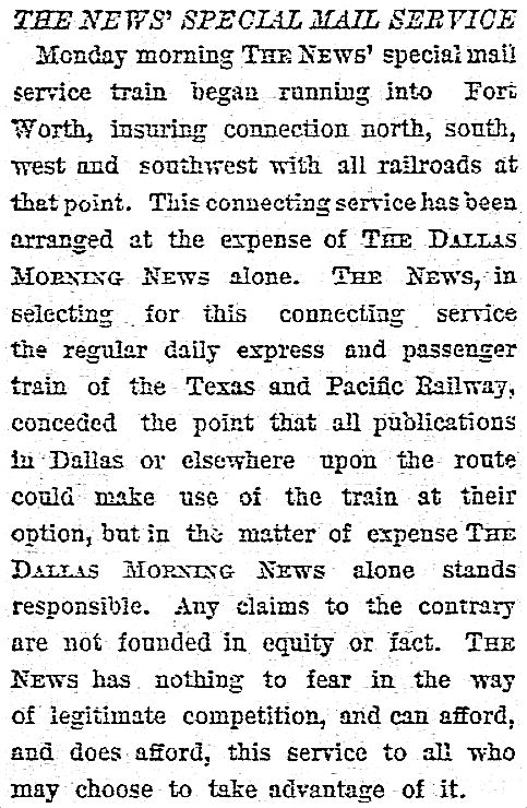 For upward of a quarter of a century the two papers have operated at their own expense, every day in the year, three special newspaper trains, one running Galveston to Houston, one Dallas to Denison and the third Dallas to Fort Worth. The Dallas News covers hundreds of thriving towns throughout its territory, many of them before breakfast time, through its unrivaled facilities of distribution. Starting in 1885, The Dallas News has been a continuous success, and has achieved an enviable reputation wherever American newspapers are known. As an advertising medium it is in a class by itself so far as papers in this section of the country are concerned. Starting at 1885 with thirty-three classified ads in its Sunday issue, it now runs each Sunday about 2,000. It is a success because it is enterprising and because it is clean, both in its news columns and in its advertising columns; because it is fair-minded and because its efforts have always been uplifting from a moral and intellectual standpoint and fair to every interest.