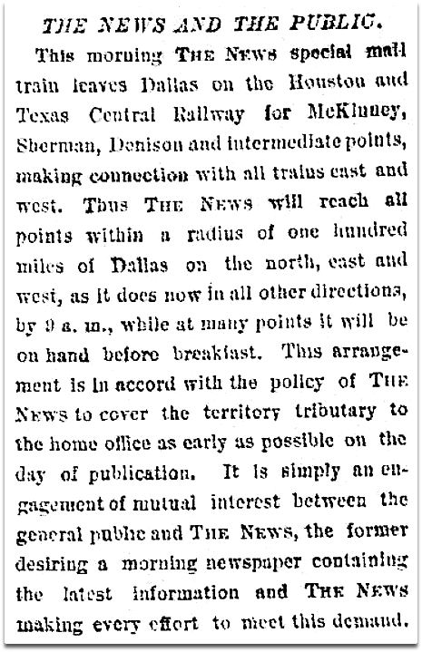 The Dallas News is the offspring of The Galveston News, which was established in 1842. The two papers are under the same management. The publication offices of The News, Galveston and Dallas, 315 miles apart, are connected by special wires for interchange of news matter. The Galveston paper supplies the southern part of the State and the Louisiana border, while the other covers all North Texas and goes well into Arkansas, Oklahoma and New Mexico.