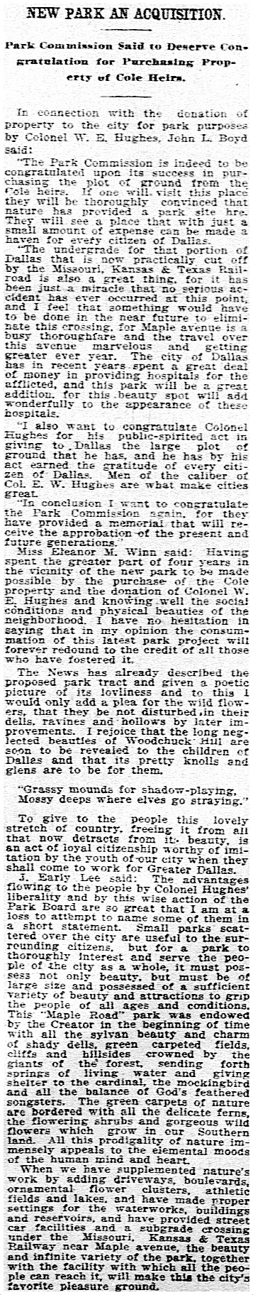 City Park (now “Old” City Park), was Dallas’ first park, acquired in 1876. It became a popular (and beautiful) recreation area, and the adjacent Browder Springs was home to the city’s first waterworks. In 1936, City Park was briefly re-named “Sullivan Park” in honor of Dan F. Sullivan, the city’s first highly accomplished Water Commissioner. But it was officially UN-re-named (or RE-re-named) and went back to being “City Park” again in May 1941, because after 60 years of being known as City Park, the “Sullivan” thing just never caught on, and the two names were causing confusion. So the name was changed back.