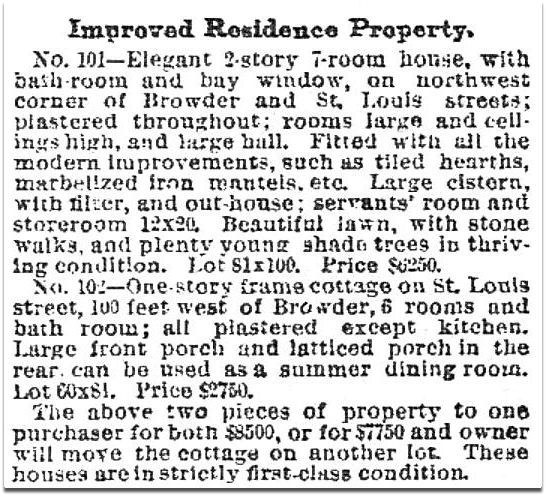In early 1887, a For Sale ad appeared in the Herald — real estate agents Ducker & Dudleigh were offering what appears to be Lots 5 and 6. By this time, houses had been built on both lots. (The numbers 101 and 102 are confusing here, but the property being offered is the lot at the northwest corner of Browder and St. Louis and the lot adjoining it.) The price for the two-story house on Lot 5 was $6,250, which the Inflation Calculator adjusts to being about $166,000 in today’s money, taking into account inflation (but not taking into account Dallas’ outrageous real estate prices!).