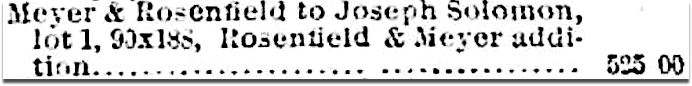 UPDATE: Max Rosenfield developed a real estate partnership with Gerson Meyer, both of whom worked for Sanger Bros. department store. They bought and sold real estate (often to fellow Sanger’s employees), apparently as a lucrative side-business (Rosenfield even conducted his real estate transactions from his Sanger Bros. office). They apparently had acquired enough land by 1886 to have their own “addition” — “Rosenfield and Meyer’s Addition” in East Dallas. The earliest mention I found of it was this ad from May, 1886.