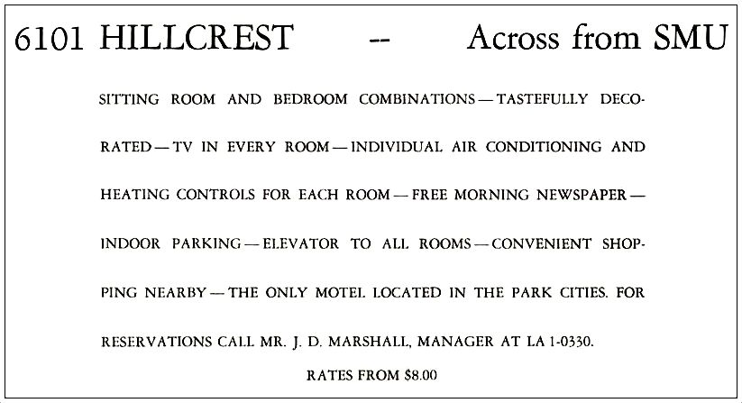 The 1965 ad has the nightly rate at the University House Motel at $8 — about $60 in today’s money, adjusted for inflation. Not bad for parents who could afford to send their children to SMU and who weren’t staying downtown at the Adolphus, the Baker, or the Hilton.