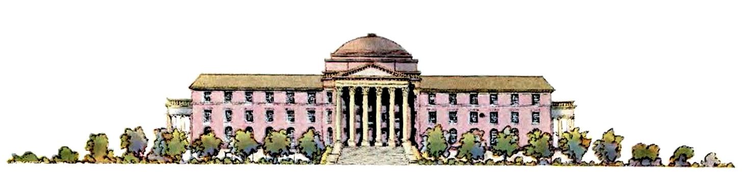 Pictured is an aerial view of campus from the southeast. At the bottom is Mockingbird Lane; on the right is Airline Road; at the top is Daniel Avenue; and on the left is Hillcrest Avenue. Situated in the middle of fields is a water tower, Dallas Hall, Atkins Hall, Rankin Hall, North Hall, South Hall, the Women’s Gymnasium, Armstrong Field, and the Morrison-Bell Track.