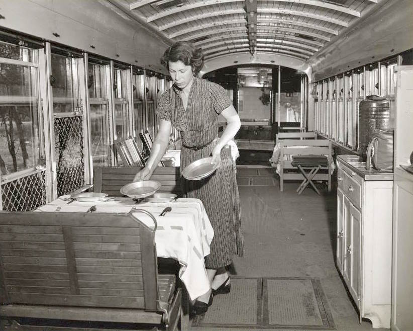 The article is referring to props needed for the giant Cavalcade of Texas historical pageant, but check out the nice little novelty “prairie schooner” below, which served as a quirky, casual Centennial restaurant (“Smacking of the old West is the Chuck Wagon, a dining place for 250, with an overgrown chuck wagon serving as the kitchen and service counter” — Dallas Morning News, June 7, 1936):